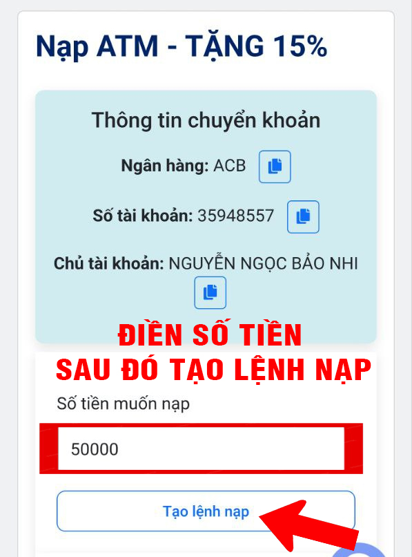 ▪️ Bước 2 : Điền số tiền -> Tạo lệnh Nạp