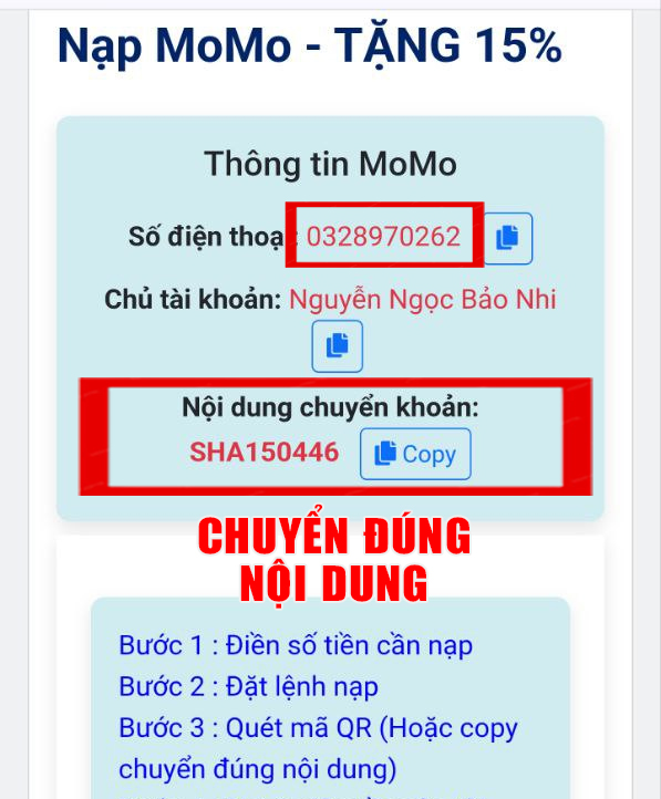 Lưu ý : MOMO nạp chậm, nếu nạp sau 23h00p quý khách nên sử dụng hình thức nạp bằng ATM.