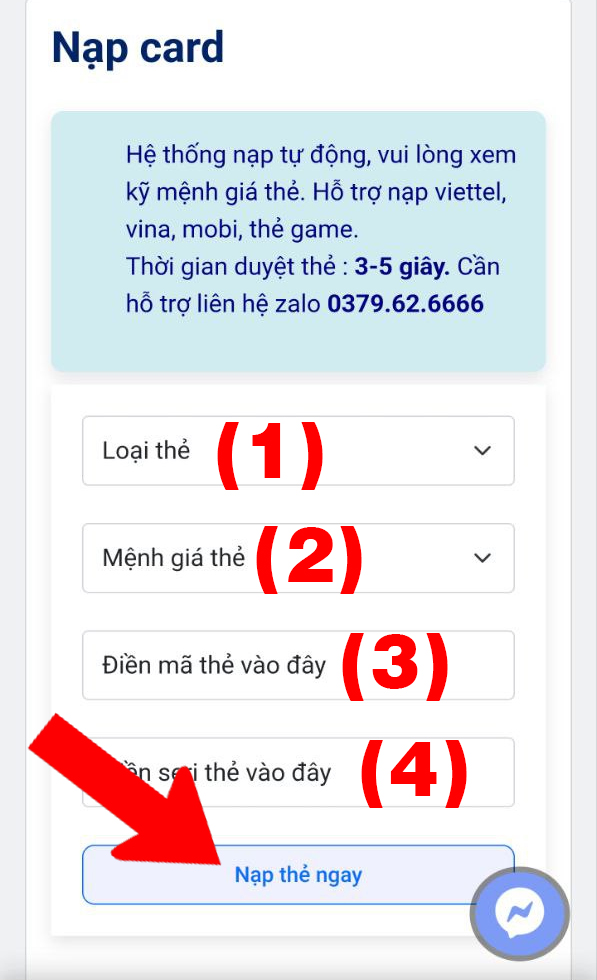 ▪️ Bước 2 : Điền đầy đủ thông tin thẻ cào -> “Nạp thẻ ngay”
